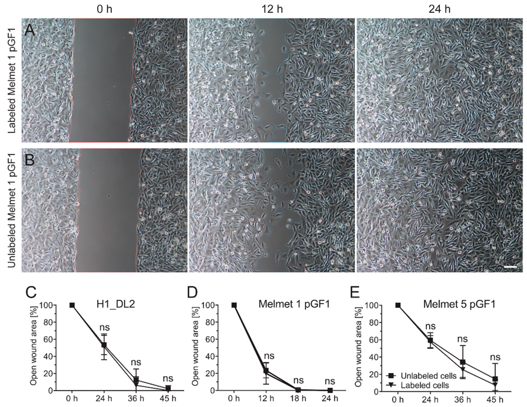To study whether labeling with the nanoprobe affected cell migration, a standardized monolayer wound healing assay was carried out (Figure 5). Labeled and unlabeled Melmet 1 pGF1 cells demonstrated similar wound healing capacities, and cell labeling did not influence migration (Figure 5A,B). The wound was closed after 18 h, both for labeled and unlabeled cells (Figure 5D). Similar results were also found for the H1_DL2 and Melmet 5 pGF1 cell lines (Figure 5C,E), as there were no differences in migration between labeled and unlabeled cells. The wounds were closed after 45 h for the H1_DL2 cells, while 15% of the initial area was still open after 45 h for the Melmet 5 pGF1 cell line.