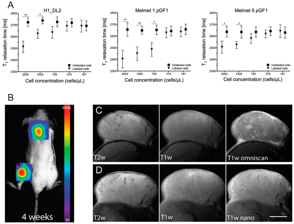 In vitro relaxometry and in vivo tumor imaging. (A) T1 relaxation times for phantoms containing labeled and unlabeled H1_DL2 cells (left), labeled and unlabeled Melmet 1 pGF1 cells (middle), and labeled and unlabeled Melmet 5 pGF1 cells (right). The different cell concentrations used are shown on the horizontal axis. Mean ± SD, n = 3. * p < 0.05; ** p < 0.01; ms: milliseconds; (B) Representative bioluminescence image of tumor growth in one of the NOD/SCID mice four weeks after injection of H1_DL2 cells in the neck and flank area; (C) Representative axial MR images of the neck tumors in the same mouse as shown in (B), eight weeks after tumor cell injection. T2 weighted image (left), T1 weighted image before contrast injection (middle), and T1 weighted image after injecting Omniscan (right); (D) Magnetic resonance (MR) images of the same mouse as in (C), using the nanoprobe as contrast agent. T2 weighted image (left), T1 weighted image before contrast injection (middle), and T1 weighted image after injecting nanoprobe (right). Scale bar, 5 mm.
