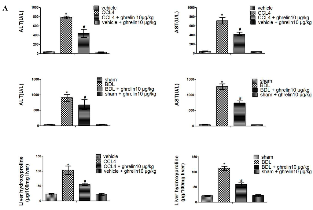 We first detected serum levels of alanine transaminase (ALT) and aspartate transaminase (AST) to evaluate the effect of ghrelin administration on liver injury. As shown in Figure 1A, serum levels of ALT and AST were significantly increased in both CCl4- and BDL-treatment groups, as compared with the control group. Ghrelin treatment obviously decreased ALT and AST levels, indicating that co-treatment significantly attenuated CCl4- and BDL-induced hepatocyte injury. Furthermore, ghrelin treatment significantly reduced the CCl4- or BDL-induced increase in hydroxyproline content, which is a known marker of total collagen content. H & E staining revealed severe pathological changes in liver sections from both CCl4 and BDL groups, as evidenced by damage or death of hepatocyte, and rearrangement of liver lobular structures, and the formation of pericellular bridging fibrosis. These areas of damaged tissues were markedly reduced in liver sections collected from the ghrelin-treated group (Figure 1B). Collagen around the extracellular spaces, especially in the portal triad, was significantly increased in liver sections from both groups. The lobules were surrounded by bundles of blue collagen fibers; however, these were markedly reduced in the ghrelin co-treated group as compared to the CCl4- and BDL-treatment groups (Figure 1B). Ghrelin administration caused no changes, as observed by pathological staining.