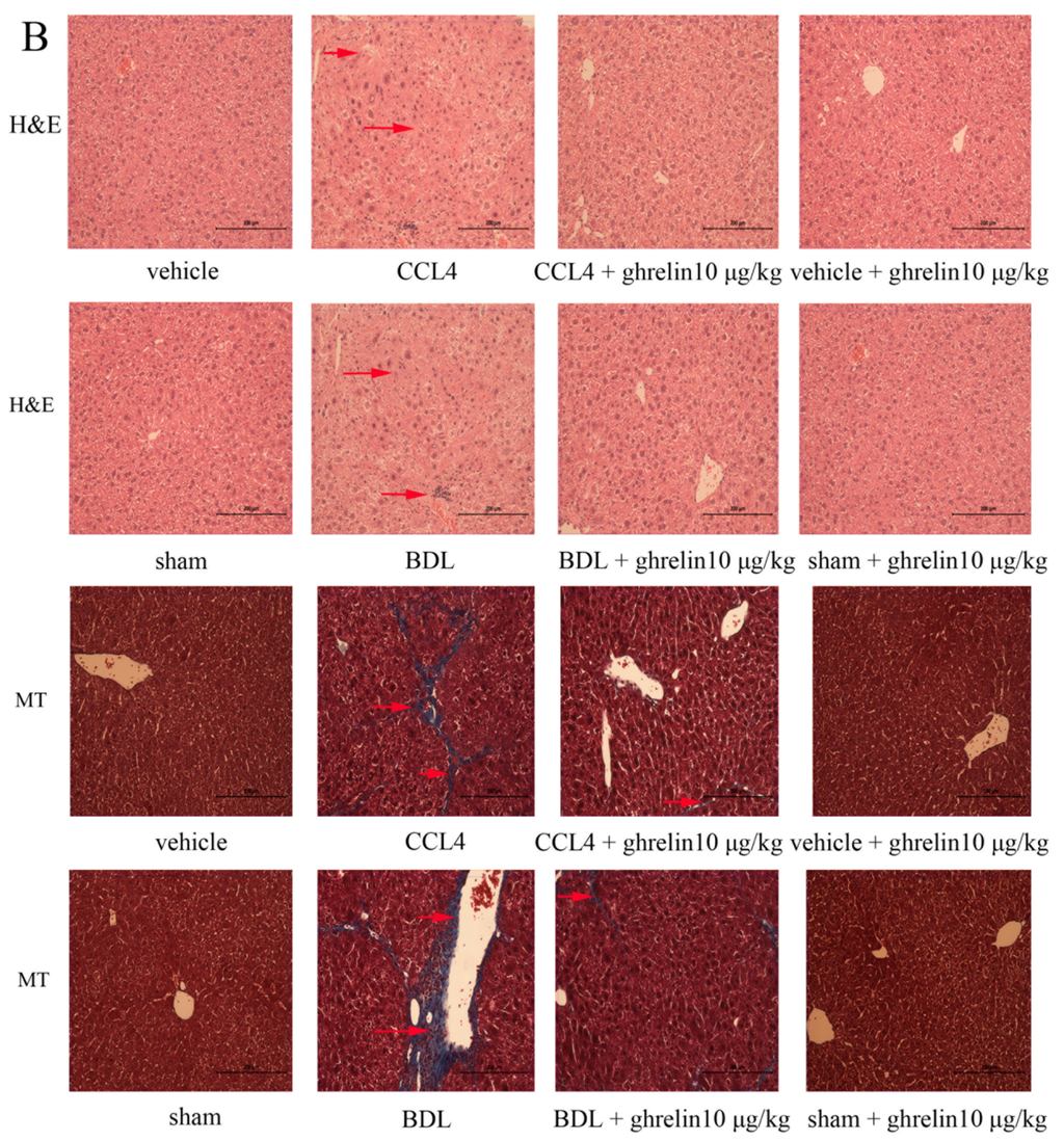 2.1. Liver Fibrosis Was Reduced by Ghrelin Administration in Both CCl4- and BDL-Induced Liver Fibrosis Mouse Models