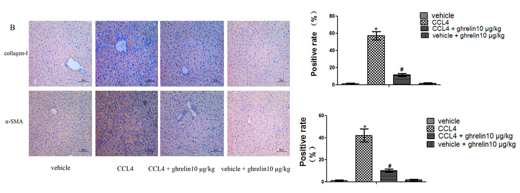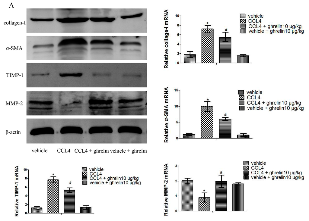 Ghrelin inhibited activation of HSCs and expression of MMP2 and TIMP1 in CCl4-induced liver fibrosis. (A) Results of Western blot and real-time PCR analyses of collagen I, α-SMA, TIMP1, and MMP2 in the CCl4 group; and (B) Immunohistochemical staining (200×) showed increased expression of collagen I and α-SMA proteins in CCl4-induced fibrotic liver tissues. The positive rate was analyzed with Image-Pro Plus 6.0. Data are expressed as the mean ± SD (n = 7, * p < 0.05 for CCl4 vs. vehicle group, # p < 0.05 for ghrelin + CCl4 vs. CCl4 group). HSCs: hepatic stellate cells; MMP: matrix metalloproteinase; TIMP: tissue inhibitor of matrix metalloproteinase; α-SMA: α-smooth muscle actin. The scale bar of each figure is 200 μm, and the magnification is 200×.