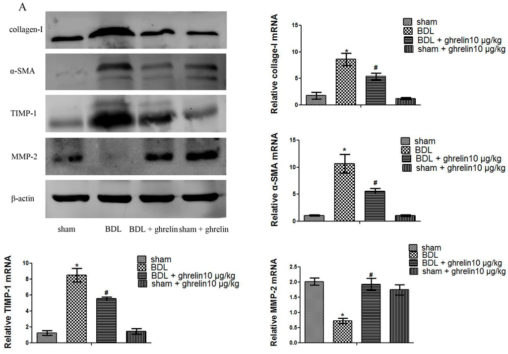As is shown in Figure 2A and Figure 3A, protein levels of collage I and α-SMA were significantly increased in the CCl4- and BDL-treatment groups, as compared with the vehicle and sham groups, while ghrelin administration reduced the expression of collage I and α-SMA. The mRNA expression levels of collagen I and α-SMA were also significantly reduced in the CCl4 + ghrelin and BDL + ghrelin groups. Moreover, we further detected protein levels of collagen I and α-SMA by immunohistochemical staining. Similar to the results of Western blot and qPCR analyses, the areas positive for α-SMA and collagen I were obviously reduced by ghrelin treatment, as analyzed with Image-Pro Plus 6.0 (Figure 2B and Figure 3B). The administration of ghrelin alone caused no change in the expression levels of any indicators, reflecting the activation of HSCs. We further observed that ghrelin treatment increased the expression of MMP2, which was reduced in the CCl4 and BDL groups. Conversely, TIMP1 expression was obviously increased in both groups and also was reduced by ghrelin treatment at both the mRNA and protein levels (Figure 2A and Figure 3A). Similar results were observed in an in vitro experiment (Figure 4). These results showed that ghrelin inhibited the activation of HSCs by promoting the expression of MMP2, which plays a significant role in the cleavage of the fibrillar ECM, while decreasing levels of TIMP1, the major inhibitor of MMPs, which promotes hepatic fibrosis.