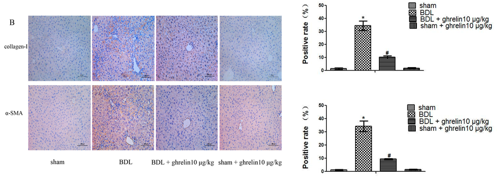 Ghrelin inhibited activation of HSCs and expression of MMP2 and TIMP1 in BDL-induced liver fibrosis. (A) Western blot and real-time PCR analyses of collagen I, α-SMA, TIMP1, and MMP2 in the CCl4 group; and (B) Immunohistochemical staining (200×) of collagen I and α-SMA protein in BDL-induced fibrotic liver tissues. The positive rate was analyzed with Image-Pro Plus 6.0. Data are expressed as the mean ± SD (n = 7, * p < 0.05 for the BDL vs. sham group, # p < 0.05 for the ghrelin + BDL vs. BDL group). The scale bar of each figure is 200 μm, and the magnification is 200×.