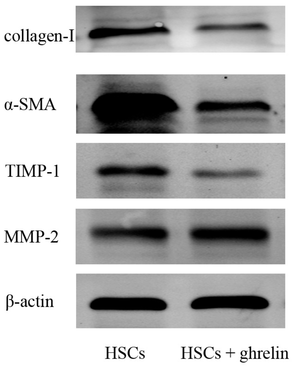 Ghrelin inhibited activation of HSCs and expression of MMP2 and TIMP1. Western blot analysis of collagen I, α-SMA, TIMP1 and MMP2.