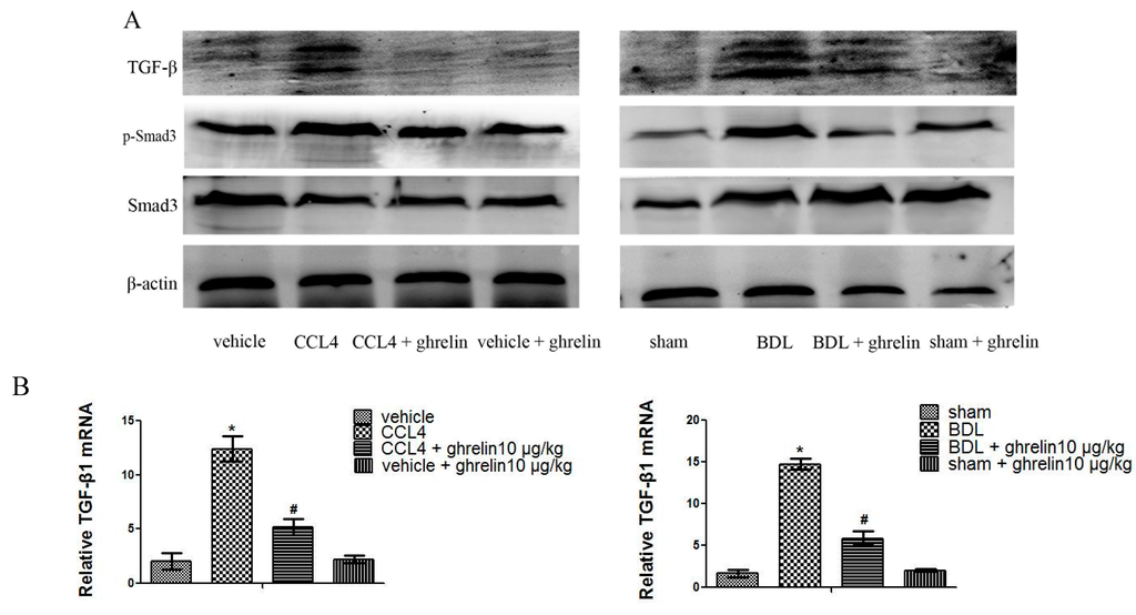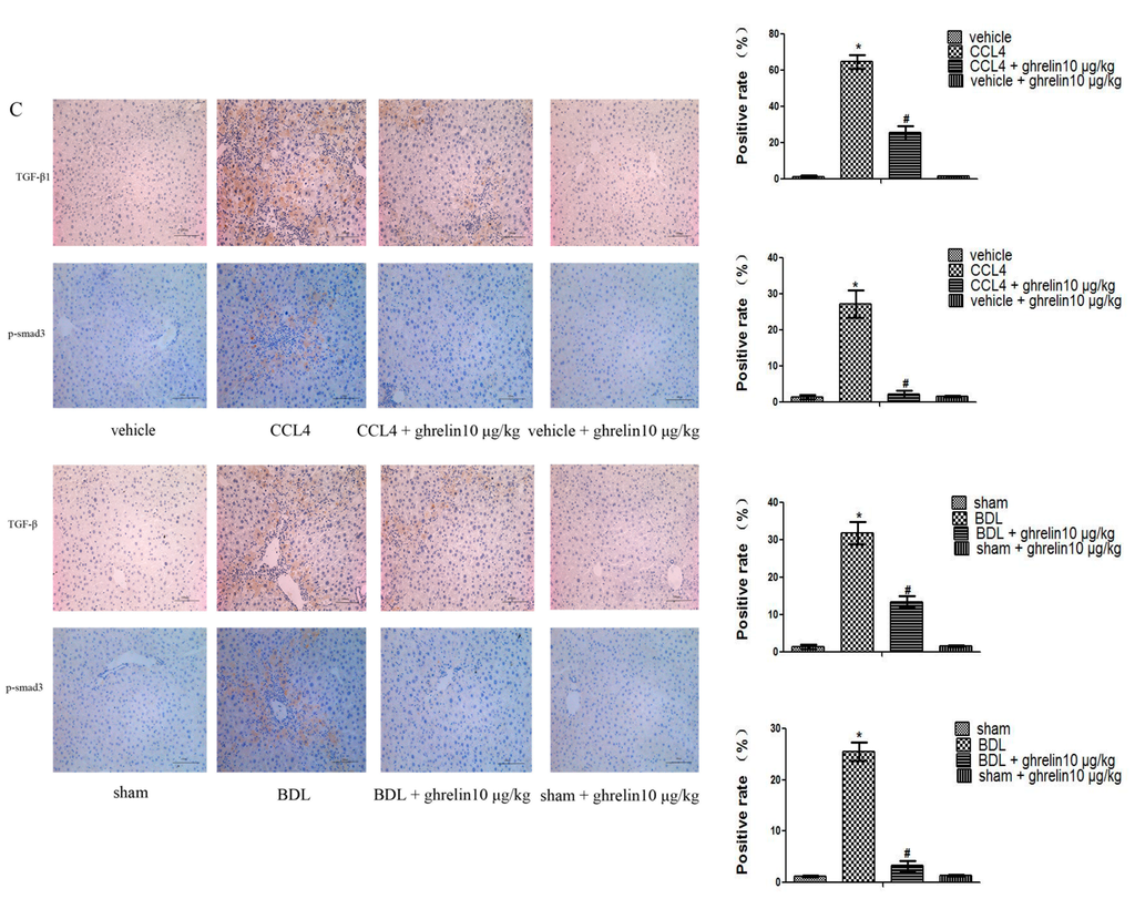Ghrelin regulates the TGF-β1/Smad3 signaling pathway. (A) Western blot analysis of TGF-β1, p-Smad3, and Smad3 in the CCl4 and BDL fibrotic mice models; (B) Real-time PCR analysis of TGF-β1 is shown and (C) Immunohistochemical staining (200×) of TGF-β1and p-Smad3 in both CCl4 and BDL-induced fibrotic liver tissues. The positive rate was analyzed with Image-Pro Plus 6.0. (n = 7, * p < 0.05 for the CCl4 or BDL group vs. the vehicle or sham group, # p < 0.05 for the CCl4 or BDL + ghrelin group vs. the CCl4 or BDL group). The scale bar of each figure is 200 μm, and the magnification is 200×.