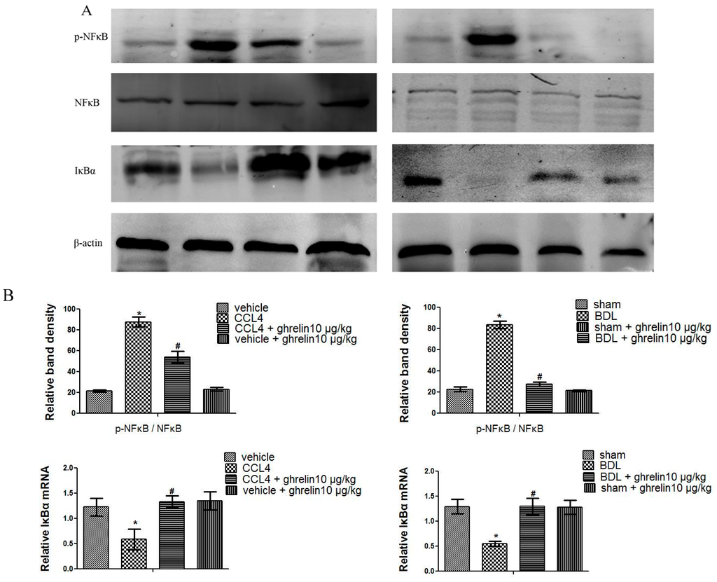 Ghrelin may be associated with NF-κB signaling pathway inhibition. (A) Western blot analysis of p-NF-κB, NF-κB, and IκBα in CCl4- and BDL-induced fibrotic liver tissues; and (B) Relative band density of p-NF-κB/NF-κB and real-time PCR evaluation of IκBα in both CCl4- and BDL-induced fibrotic liver tissues. (n = 7, * p < 0.05 for the CCl4 or BDL group vs. the vehicle or sham group, # p < 0.05 for the ghrelin + CCl4 or BDL group vs. the CCl4 or BDL group).
