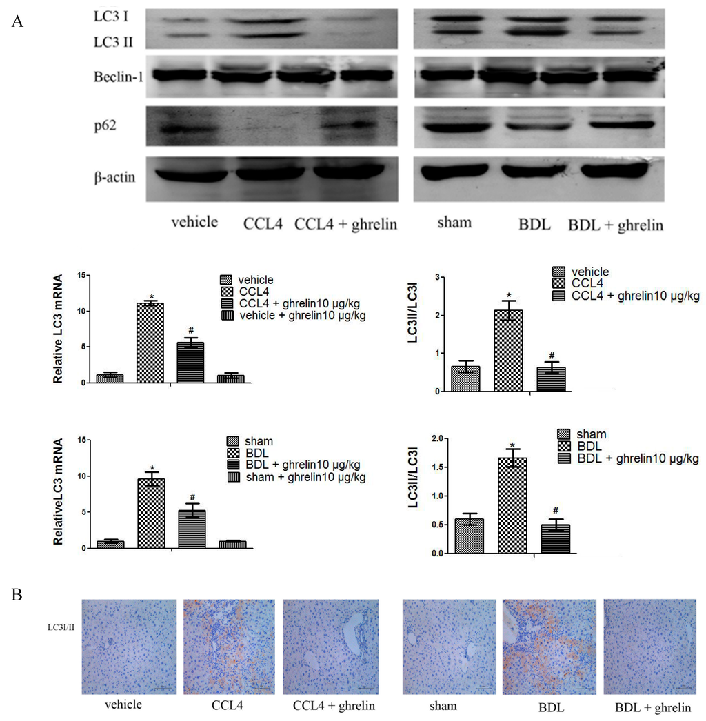 Ghrelin inhibited the process of autophagy in liver fibrosis. (A) Western blot analyses of LC3I/II, Beclin-1 and p62 in both the CCl4- and BDL-induced fibrotic liver tissues. Real-time PCR shows gene expression of LC3 (n = 7, * p < 0.05 for the CCl4 or BDL group vs. the vehicle or sham group, # p < 0.05 for the ghrelin + CCl4 or BDL group vs. the CCl4 or BDL group); and (B) Immunohistochemical staining (200×) of LC3I/II in the CCl4- and BDL-induced fibrotic liver tissues. The scale bar of each figure is 200 μm, and the magnification is 200×.