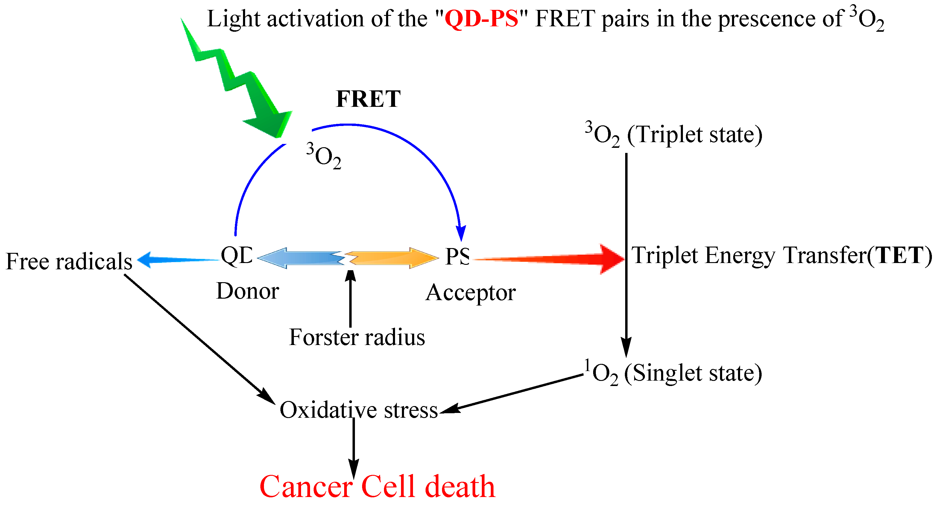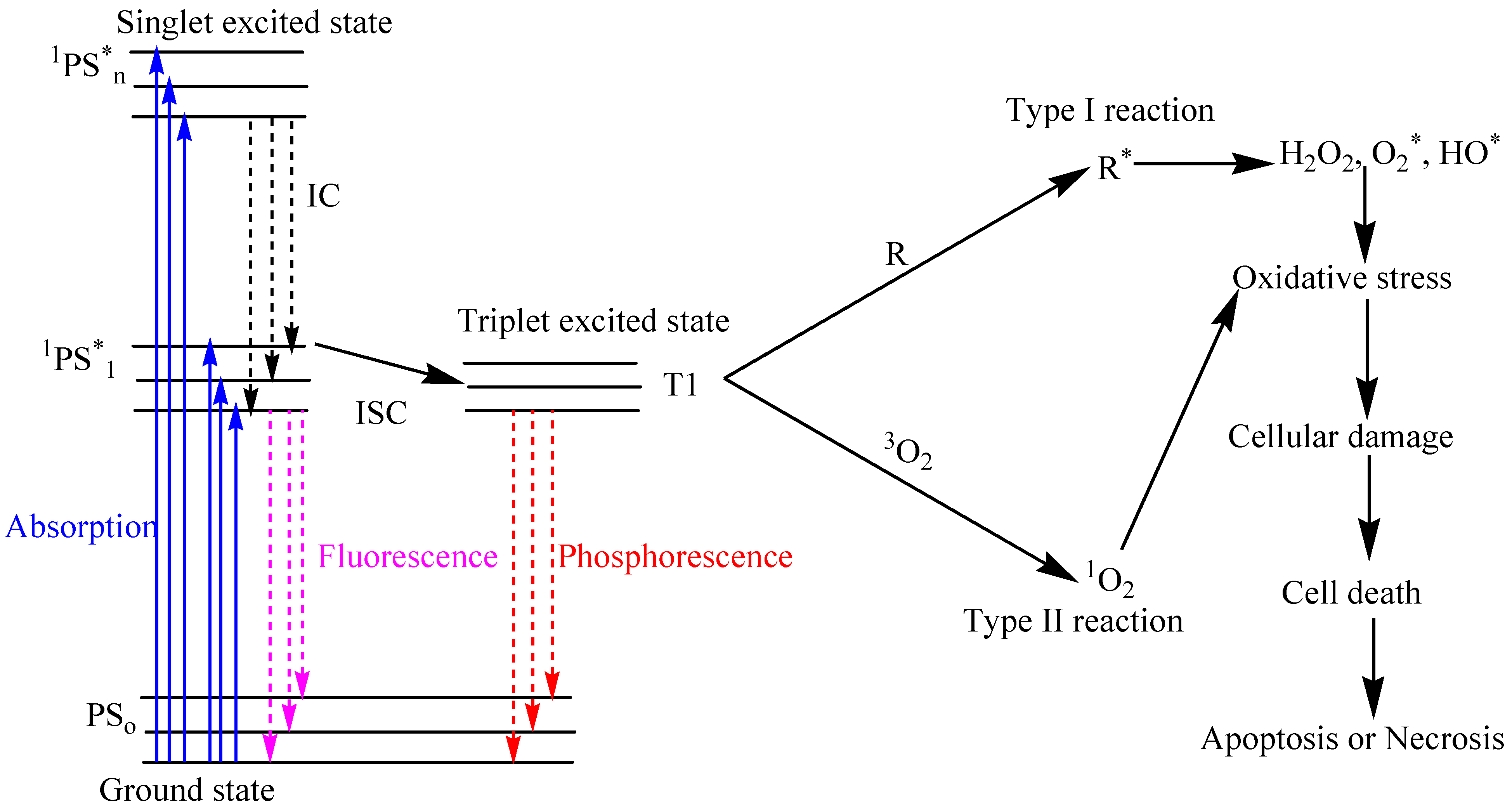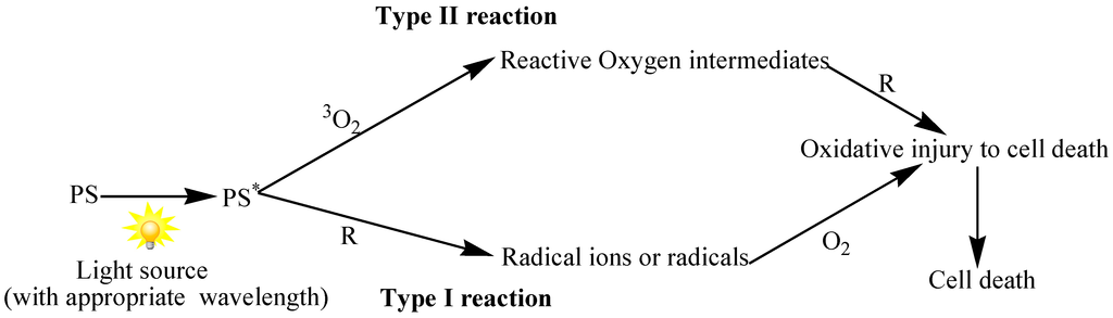 Photodynamic therapy (PDT) is a non-invasive therapeutic method that is effective against cancers, bacteria, virus, and other microbes [1,2]. The three key players of PDT include light, photosensitizer (PS), and oxygen. After light exposure at a specific wavelength, the PS is excited from the ground state (S0) to the excited singlet state (S1) and undergoes intersystem crossing to a longer-lived excited triplet state (T1), as shown in Figure 1 [3,4]. Photosensitizers may undergo one of two types of reactions at the T1 state [5], including type I reaction where excited molecules react with the substrate to generate active radicals that in turn react with biological components such as plasma membrane, peptides, proteins, and nucleic acids [6,7], or Type II reaction, which involves the transfer of energy from the activated photosensitizers to oxygen molecules in the excited single state [8] (Figure 2). Both reactions occur instantaneously and the likelihood of their occurrence is dependent on the type of photosensitizer used, the abundance of substrate and oxygen, as well as the binding affinity of the sensitizer for the substrate [9]. On the other hand, PDT is restricted to local and proximal cells due to short half-life of reactive oxygen species (ROS) [9]. In order for the system to be effective, damages incurred from PDT must exceed that repairable by the cell repair mechanism [10].
