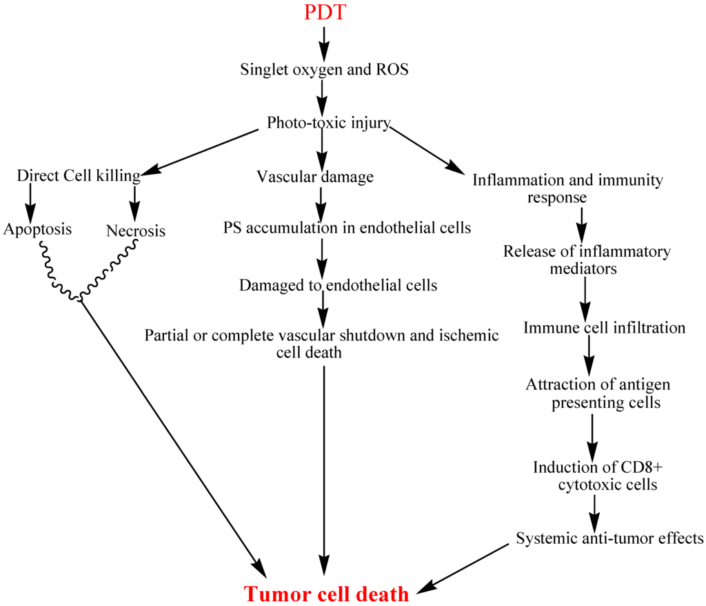 Mechanisms through which PDT may exhibit anti-tumor activity have been explored in various studies and include (a) direct tumor cell damage; (b) damage to the vasculature; and (c) inducing inflammatory and immune response which briefly summarized in Figure 3 [11,12,13,14].