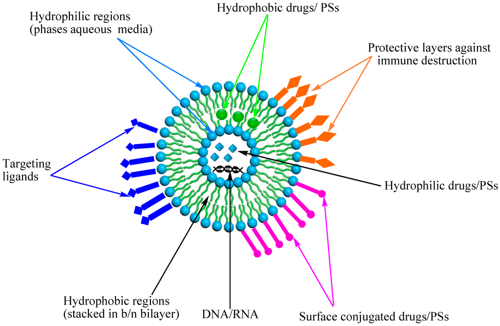 Liposomes are synthetic lipid vesicles made up of one or more concentric phospholipid bilayers as depicted in Figure 4 [84]. Phosphatidyl inositol, phosphatidyl serine, and phosphatidyl choline are the most commonly used lipids to prepare liposomes and may be used alone or in combination with other substances to vary the liposomes’ physio-chemical and biological properties such as size, drug loading capacity, and permeability [91]. Liposomes have both a hydrophilic and hydrophobic region, thereby permitting the encapsulation and transport of both hydrophilic and hydrophobic PS [92]. Several studies have shown strong evidence that liposomal formulations of PS is effective in PDT. Jiang et al. reported that PDT using liposome-encapsulated Photofrin resulted in more significant destruction of U87 glioma brain tumor as compared to Photofrin loaded in dextrose vehicles [93]. Selectivity towards tumor tissues was demonstrated with liposomal Photofrin while concentration of the PS was similar in normal tissues after treatment with liposomal and free Photofrin. Similar results have been observed in different tumor cell models using different photosensitizers [94,95].