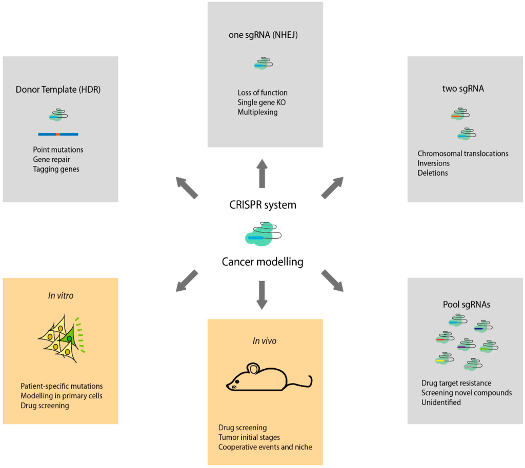 Human tumor-associated processes have a common major driving force, namely genome alterations [43]. Alterations that include large chromosomal rearrangements (i.e., translocations, duplications, deletions or inversions) and point mutations lead to inactivation of tumor suppressor genes (TSGs), activation of oncogenes and alteration of genes involved in repair processes. CRISPR-Cas9 has become the tool of choice for mimicking these scenarios, not only because of its ease of application, but also because of its efficiency and accuracy.