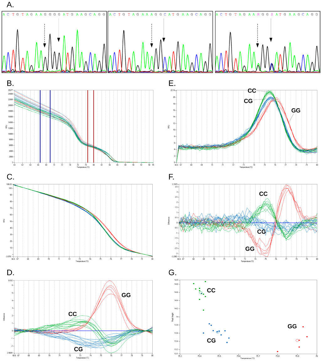 - Van der Stoep, N.; van Paridon, C.D.M.; Janssens, T.; Krenkova, P.; Stambergova, A.; Macek, M.; Matthijs, G.; Bakker, E. Diagnostic guidelines for high-resolution melting curve (HRM) analysis: An interlaboratory validation of BRCA1 mutation scanning using the 96-well LightScanner™. Hum. Mutat. 2009, 30, 899–909. [Google Scholar] [CrossRef] [PubMed]