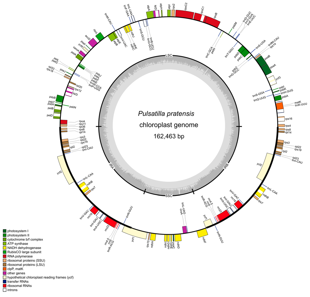 Gene map of the Pulsatilla pratensis plastid genome. Genes shown outside the outer circle are transcribed clockwise, and genes inside the outer circle are transcribed counterclockwise. Genes belonging to different functional groups are color coded. The dashed area in the inner circle indicates the guanine-cytosine (GC) content of the plastid genome.