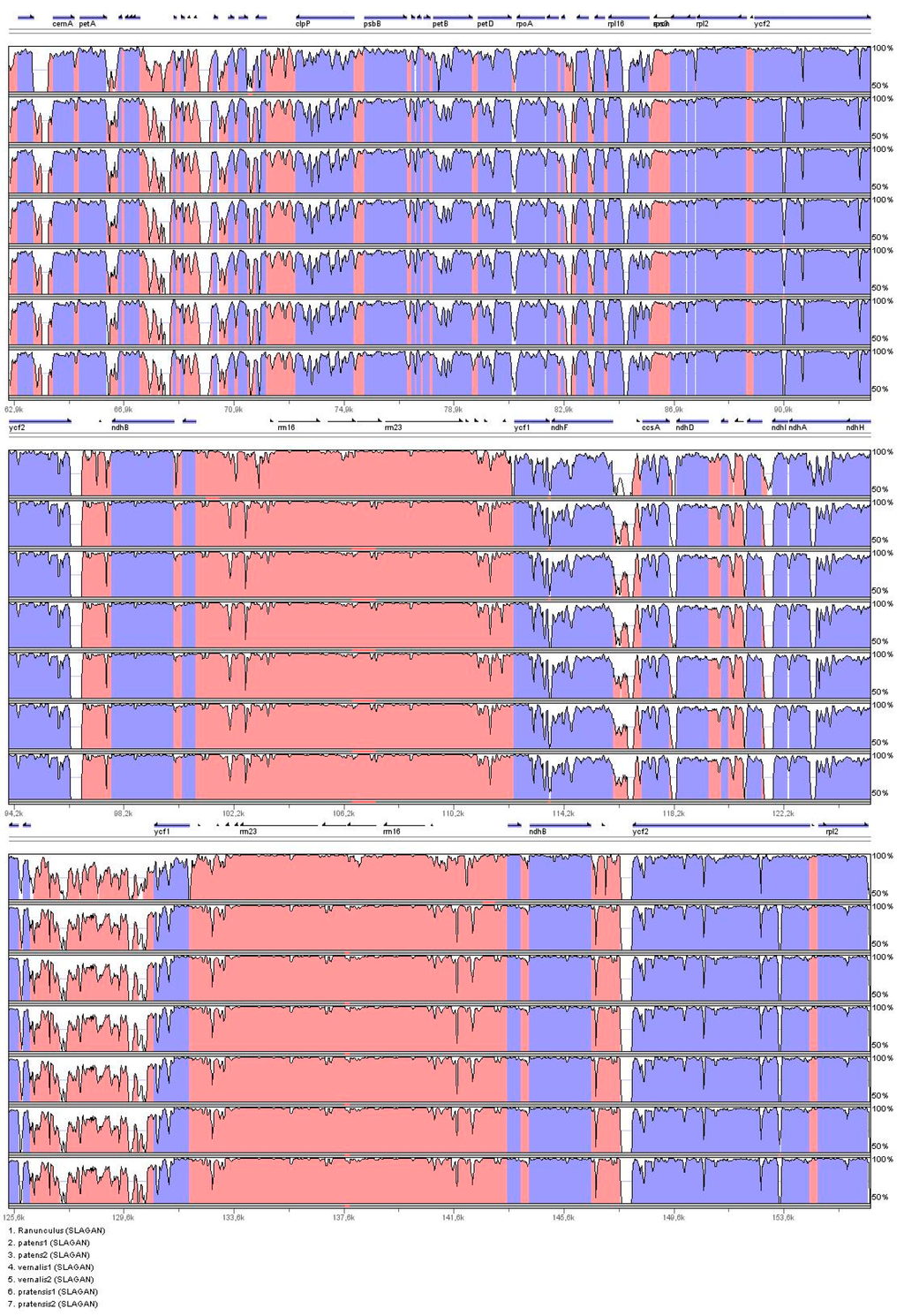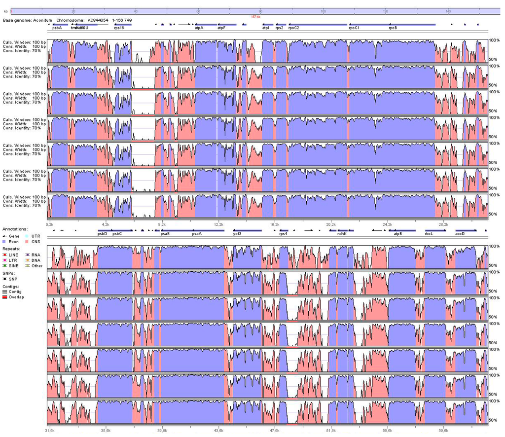 Alignment of eight plastid genome sequences in plants of the family Ranunculaceae. VISTA-based identity plots show sequence identity between six sequenced plastid genomes and the previously-identified sequences in Ranunculus macranthus and Aconitum barbatum as a reference. The red and purple parts visualize the conserved non-coding and coding regions respectively.