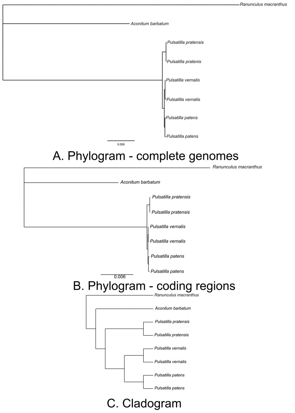 An analysis of variation in the genomes of three closely-related, sympatric species of the genus Pulsatilla revealed cpDNA regions that can be effectively used in phylogenetic, phylogeographic and population genetic studies. The investigated species can be successfully identified based on several regions of the plastid genome, as well as based on the nuclear ITS2 region. Our findings can prove to be highly useful in the research of the hybridization in the genus Pulsatilla. A comparative analysis of plastomes in the species of the family Ranunculaceae revealed a high rate of changes in genomic structure, but only minor differences in gene content.