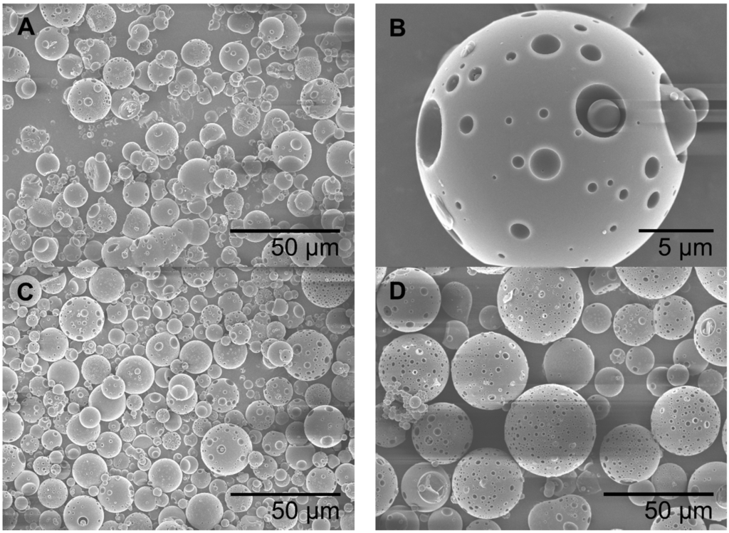Scanning electron microscopy of albumin-lactosylated microspheres (MS-Lac). (A) MS-Lac1; (B) zoom in MS-Lac1; (C) MS-Lac2; (D) MS-Lac3.