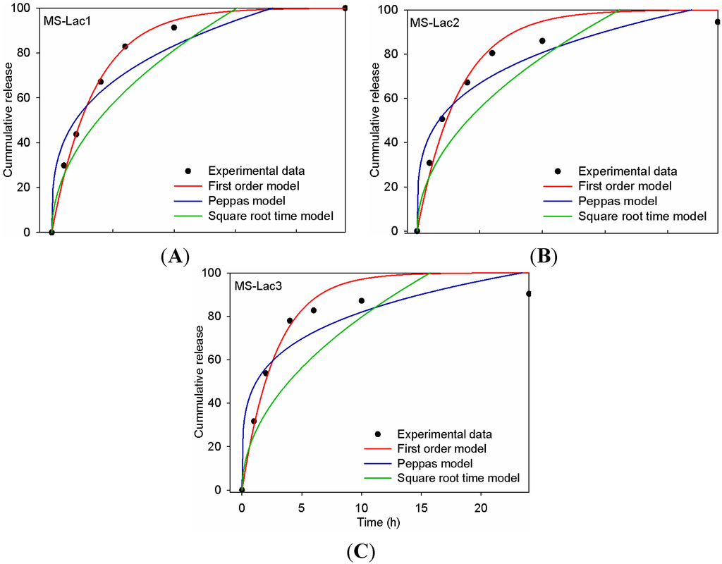 Models and experimental data matching the cumulative release of gentamicin from lactosylated microspheres (MS-Lac). (A) MS-Lac1; (B) MS-Lac2; (C) MS-Lac3. Data are the average of three independent release experiments.