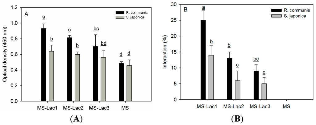 K88 adhesins presented a higher recognition for all lactosylated microspheres than for non-lactosylated microspheres. The interaction displayed no significant difference (p > 0.05) between MS-Lac1 and MS-Lac3 or MS-Lac2 and MS-Lac3. However, a statistical difference (p < 0.05) was observed between MS-Lac1 and MS-Lac2 and the control (Figure 4).