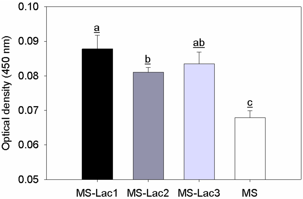Recognition assay of partially-purified K88 adhesin for lactosylated (MS-Lac) and non-lactosylated (MS) albumin microspheres using ELLA assays. Experiments were performed in triplicate and evaluated by analysis of variance (ANOVA) followed by the application of Tukey’s test; p ≤ 0.05. Means (a, b, ab and c, respectively) with the same letter are not significantly different.