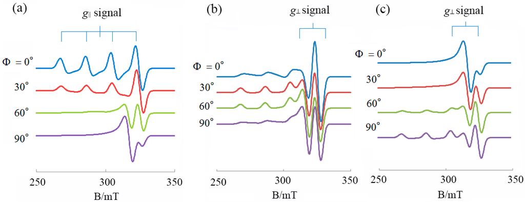 Typical DNA-fiber EPR spectra calculated for a planar Cu(II) complex with the g|| axis perpendicular to the coordination plane are shown in Figure 2. The details of the calculations have been reported elsewhere []. As shown in Figure 2a, when the g|| axis is parallel to Zf axis (θ0 = 0°), the intensity of the g|| signal has its maximum at Ф = 0° and minimum at Ф = 90°, and vice versa for the g signal. On the other hand, when the g|| axis is perpendicular to Zf axis (θ0 = 90°, Figure 2c), the intensity of the gsignal has its maximum at Ф = 0° and minimum at Ф = 90°, and vice versa for the g|| signal. When the g|| axis is inclined by 45° from Zf axis (Figure 2b), the intensity of the g|| signal has its maximum when Ф = 30°–60°.
