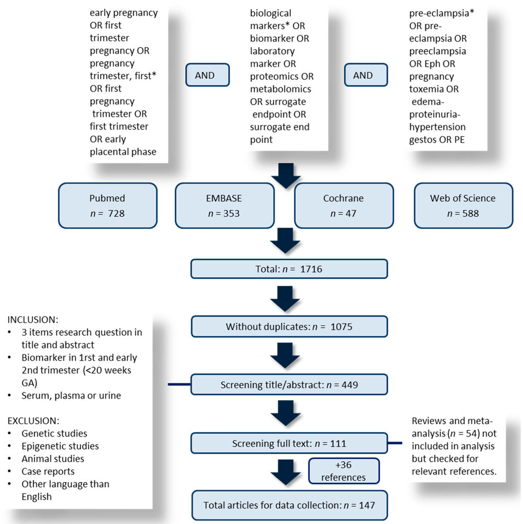 Due to the complex pathophysiology and aetiology of PE, a wide range of potential biomarkers have been investigated [7]. These biomarkers can be classified under different categories and many novel biomolecules have been identified. In addition to the predictive value of biomarkers, the identification of these entities (e.g., metabolomic or proteiomic molecules) may elucidate the underlying mechanism for the pathogenesis of PE. Although no single biomarker has been deemed suitable for clinical application at present [8] various novel biomarkers or combinations of biomarkers with other well recognized clinical parameters are promising. To this end, we conducted a systematic review and meta-analyses of biomarkers during the first half of pregnancy for the prediction of PE.