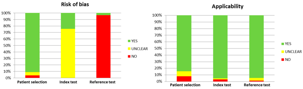 An adapted version of the Quality Assessment of Diagnostic Accuracy Studies (QUADAS-2) tool was used to determine the methodological quality of the selected studies as not all items of the tools were relevant to our review [65,66]. Summary scores were not calculated as their interpretation is difficult and may be potentially misleading [67].
