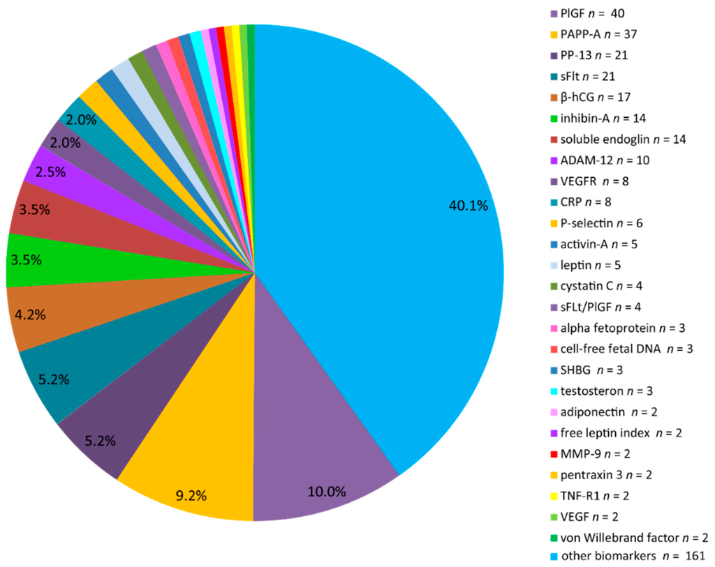 Distribution of studied laboratory biomarkers (n = 401) in included articles (n = 147). PlGF: Placental growth factor; PAPP-A: Pregnancy associated plasma protein A; PP-13: Placental protein 13; ADAM-12: a disintegrin and metalloprotease 12; CRP: C-reactive protein; sFlt: Soluble fms-like tyrosine kinase-1; MMP-9: Matrix metallopeptidase 9; TNF-R1: Tumour-necrosis factor receptor-1; VEGF: Vascular endothelial growth factor; VEGFR: Vascular endothelial growth factor receptor; SHBG: Sex hormone-binding globulin.