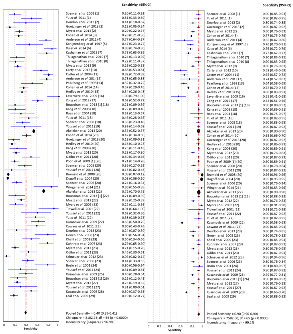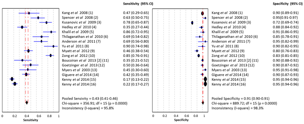 Meta-DiSc (version 1.4; Zamora et al., Madrid, Spain) [68] was used for statistical analyses. A pooled sensitivity and specificity was calculated, as well as a Summary of Receiver Operating Characteristics Curve (SROC). Raw data were used from each study, as adjustments for confounding effects varied between different studies. The inverse variance of the study was used to determine the weighting of studies in the meta-analyses. The random effects model was chosen due to the expected clinical and statistical heterogeneity among the studies. We assessed the heterogeneity of the results among studies through visual examination of Forest plots of AUC’s, and using the I2 test [69]. For all effect estimates, a value of p < 0.05 was considered to be statistically significant.