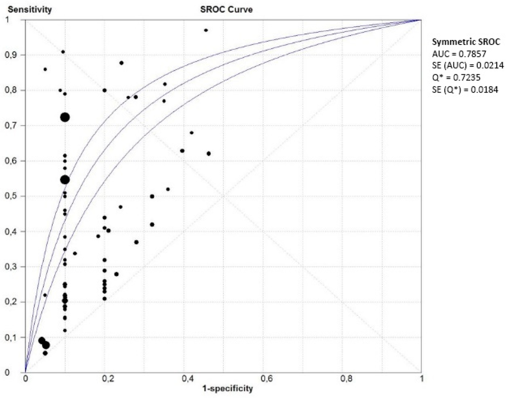 In studies which analysed women with PE without sub-classifying into EOPE and LOPE, the pooled sensitivity of all single biomarkers (n = 66) was 0.40 (95% CI 0.39–0.41, I2 96.9%) at a false positive rate of 10% (Figure 4). The area under the SROC was 0.786 (SE 0.02) (Figure 5). The pooled sensitivity, specificity and area under the SROC of the separate meta-analyses of ADAM-12, inhibin-A, PAPP-A, PlGF and PP-13 are shown in Table 2. All these meta-analyses showed a high heterogeneity (I2 > 50%).
