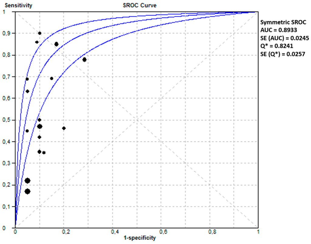 - Reitsma, J.B.; Glas, A.S.; Rutjes, A.W.; Scholten, R.J.; Bossuyt, P.M.; Zwinderman, A.H. Bivariate analysis of sensitivity and specificity produces informative summary measures in diagnostic reviews. Clin. Epidemiol. 2005, 58, 982–990. [Google Scholar] [CrossRef] [PubMed]