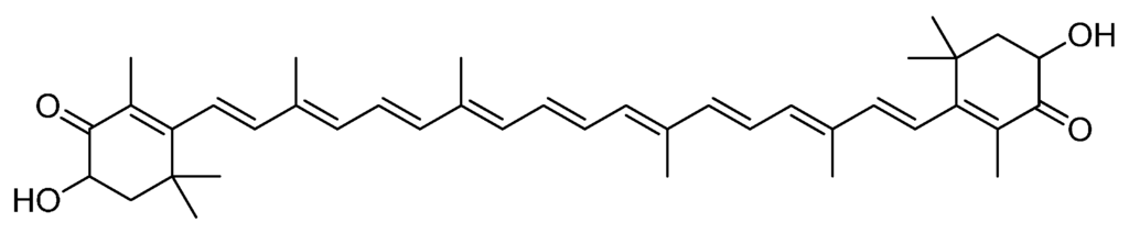 Astaxanthin (3,3′-dihydroxy-β,β′-carotene-4,4′-dione, for chemical structure see Figure 1) is a xanthophyll carotenoid [1] which naturally occurs in algae, krill, trout, crayfish, and salmon. Astaxanthin is widely used in aquaculture nutrition as a coloring agent [2]. In addition to its coloring properties, astaxanthin may also affect immune status and reproduction [3,4].