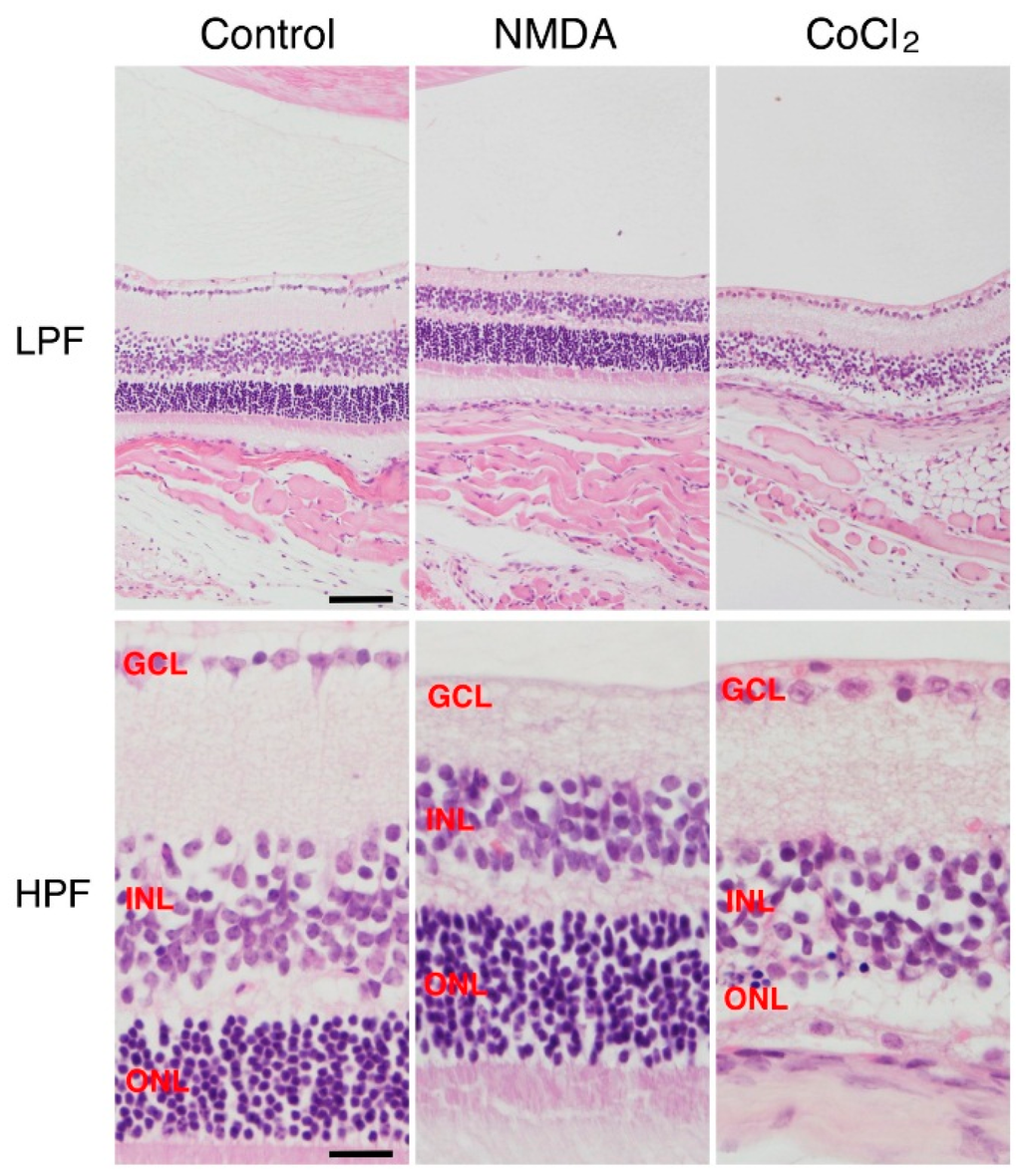 Retinal cell degeneration induced by NMDA and CoCl2 in mice. Representative photographs show a vehicle-treated normal control retina, NMDA-treated retina (15 mM NMDA, 2 μL/eye) and CoCl2-treated retina (9 mM CoCl2, 2 μL/eye) at 7 days after intravitreal injection. The NMDA-treated retina demonstrates disappearance of ganglion cells in GCL and CoCl2-treated retina shows degeneration of photoreceptor cells in ONL. LPF, low-power field; HPF, high-power field; NMDA, N-methyl-d-aspartate; GCL, ganglion cell layer; INL, inner nuclear layer; ONL, outer nuclear layer. Scale bars in left upper and left lower panels indicate 80 μm and 20 μm, respectively.