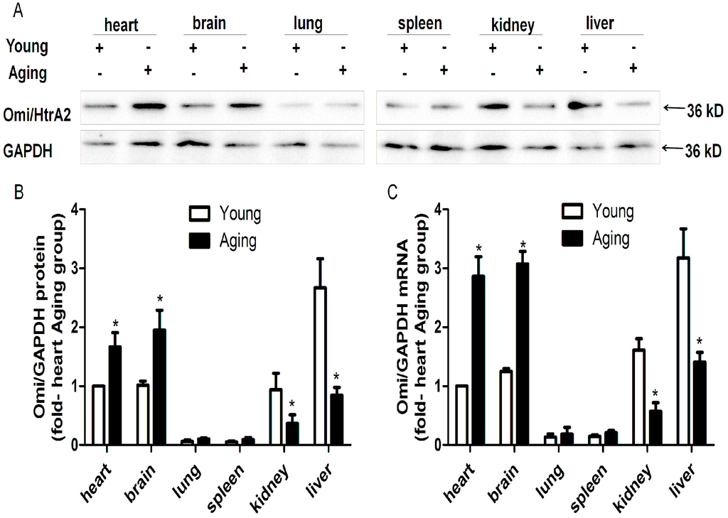 Tissue specific expression of HtrA serine peptidase 2 (Omi/HtrA2). Omi/HtrA2 protein expression in young and aging mice was detected by Western blotting (A), and the relative levels were quantified using ImageJ software (B). Omi/HtrA2 mRNA expression was detected by quantitative RT-PCR (C). n = 5 per group. * p < 0.05 vs. young.