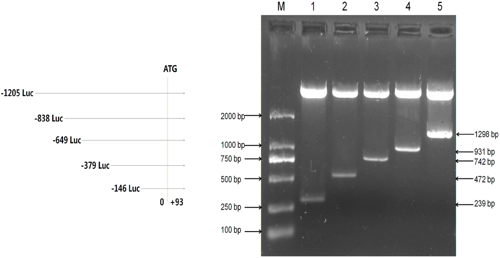 To analyze transcriptional activity of the mouse Omi/HtrA2 gene promoter, we amplified different lengths of the mouse Omi/HtrA2 gene promoter by PCR. Five products were amplified using F1–F5 as upstream primers with R as a downstream primer (Table 1). The predicted products were verified by 1% agarose gel electrophoresis (Figure S1) followed by sequencing. The five truncated PCR products were cloned into PMD-18T, and then subcloned into the pGL3 luciferase reporter vectors (pGL3). The resulting five luciferase reporter plasmids (named pGL3-239, pGL3-472, pGL3-742, pGL3-931, and pGL3-1298 according to length) were confirmed by KpnI and HindIII digest (Figure 2).