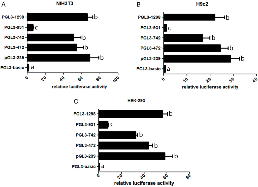 Relative luciferase activity of full length and truncated mouse Omi/HtrA2 promoter plasmids. Luciferase assays were performed in NIH3T3 cells (A); H9c2 cells (B); and HEK-293 cells (C). The different letters indicate the significant differences between the plasmids (p < 0.05).