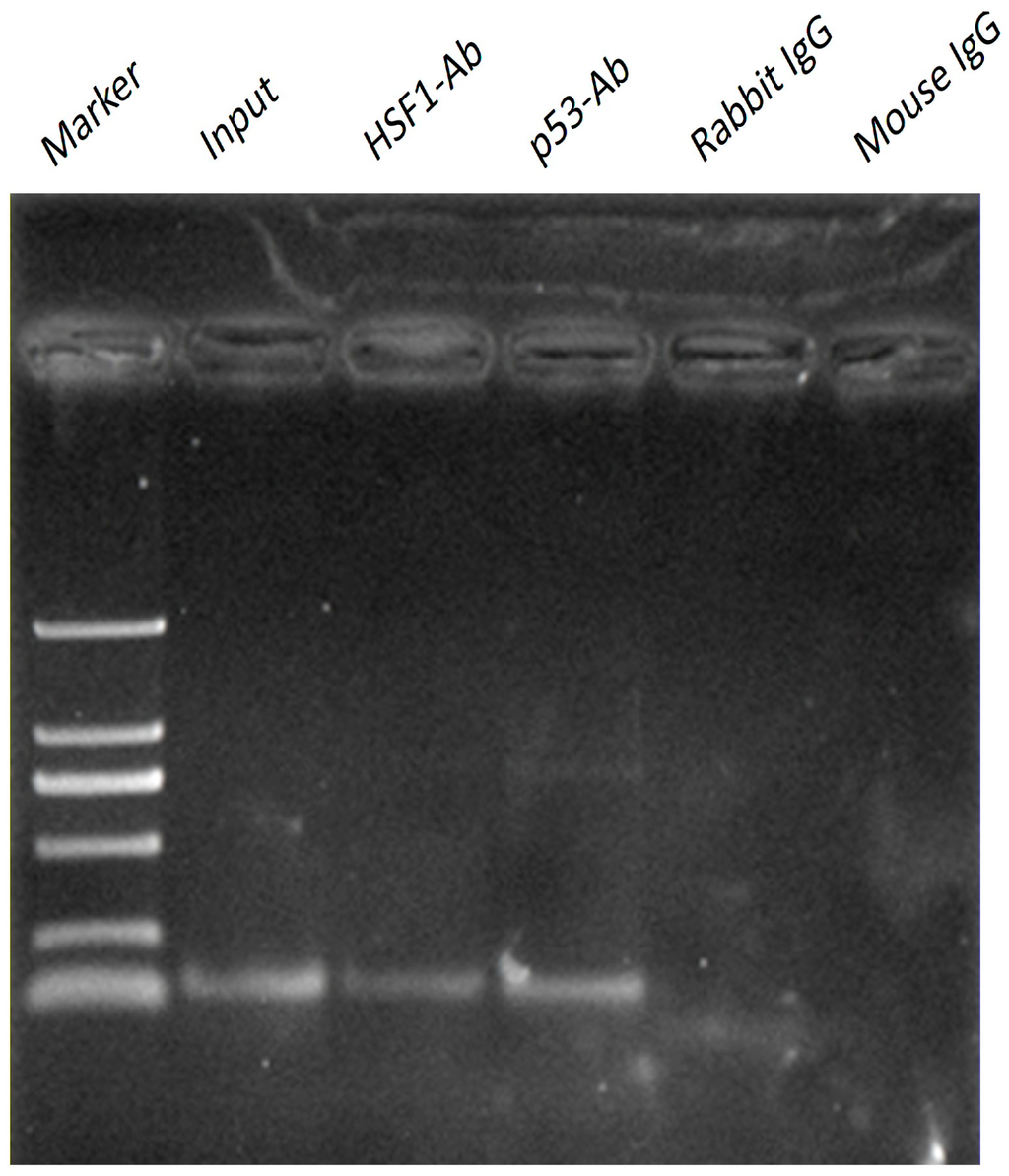 Chromatin Immunoprecipitation(ChIP) was performed with chromatin prepared from mouse heart. The promoter region containing the Heat shock transcription factor 1 (HSF1) and p53 site was analysed by PCR following immunoprecipitation with the HSF1 and p53 antibodies. Results of amplification for soluble chromatin before immunoprecipitation are shown as positive control (input) and negative control (IgG).