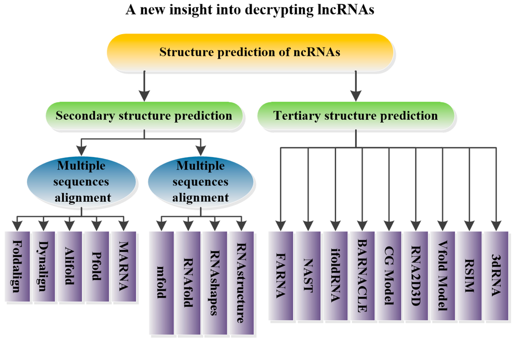 This review focuses on lncRNAs, which comprise the least understood class of ncRNAs. Their functions, mechanisms, roles in epigenetics and relationships with diseases are introduced. Moreover, ncRNA structure prediction methods such as Foldalign [30], Pfold [31], Mfold [32], RNAfold [33], RNAshapes [34], RNAstructure [35], NAST [36], iFoldRNA [37], and 3dRNA [38] are reviewed (Figure 1). Furthermore, the theories underlying each method as well as the advantages and pitfalls of their applications are provided. Based on this summary, another step in the understanding of lncRNAs can be achieved. As the secondary/tertiary structures of several functionally understood lncRNAs have been predicted (or experimentally verified), RNA structure predictions may help identify additional functional lncRNAs and may thus offer clues for the design of targeted small molecule therapeutics to promote drug development and the treatment of diseases [39].