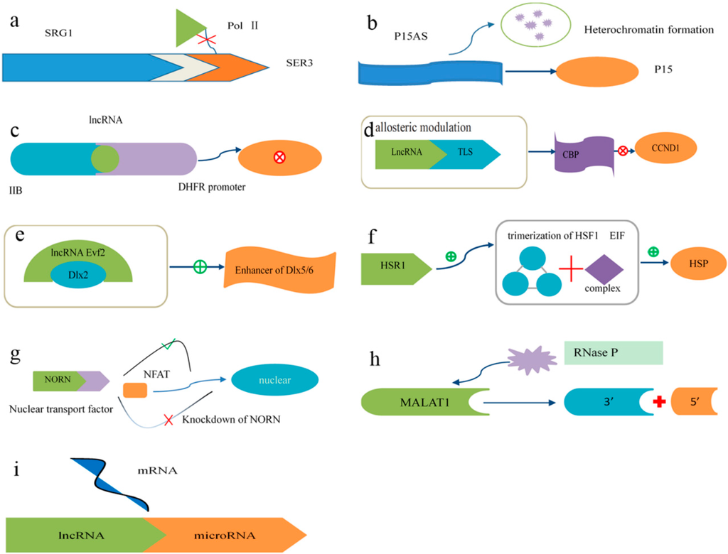 Mechanisms of lncRNA action in transcriptional regulation. (a) Transcription of the lncRNA SRG1 inhibits the expression of the SER3 gene by interfering with the binding of RNA polymerase II to DNA; (b) The expression of the p15 antisense RNA, the lncRNA of a tumor suppressor gene, results in the silencing of the p15 gene through the induction of heterochromatin formation, which persisted after the p15 antisense RNA was turned off; (c) lncRNA binds to the major DHFR promoter and IIB, a general transcriptional factor, to form a stable and specific complex to dissociate the preinitiation complex from the major DHFR promoter; (d) As a response to stress, the RNA-binding protein TLS, under allosteric modulation via lncRNA upstream of CCND1, binds to chromatin-binding protein (CBP) and inhibits CBP/P300 HAT activities on CCND1; (e) The lncRNA Evf2, a crucial co-enhancer of regulatory proteins involved in transcription, cooperates with the Dlx2 protein to activate the Dlx5/6 enhancer in a target gene; (f) In response to heat shock, the lncRNA HSR1 (heat shock RNA-1) promotes the trimerization of HSF1 (heat-shock transcription factor 1), and consequently the translation factor EIF interacts with HSR1 and HSF1 to forms a complex to facilitate the expression of heat-shock protein (HSP); (g) NFAT is nuclear factor of activated T cells. The lncRNA NRON (noncoding repressor of NFAT) may form a complex with importin proteins to regulate the subcellular localization of NFAT. The knockdown of NRON increases the expression and activity of NFAT; (h) The lncRNA metastasis-associated lung adenocarcinoma transcript 1(MALAT1) has been shown to be abnormally expressed in many human cancers. The nascent MALAT1 transcript is cleaved by RNase P to produce the 3′ end of the mature MALAT1 transcript and the 5′ end of the small RNA; (i) Several studies have elucidated that some lncRNAs can act as microRNA sponges to competitively bind to microRNAs and decrease microRNA-induced tumorsphere differentiation.