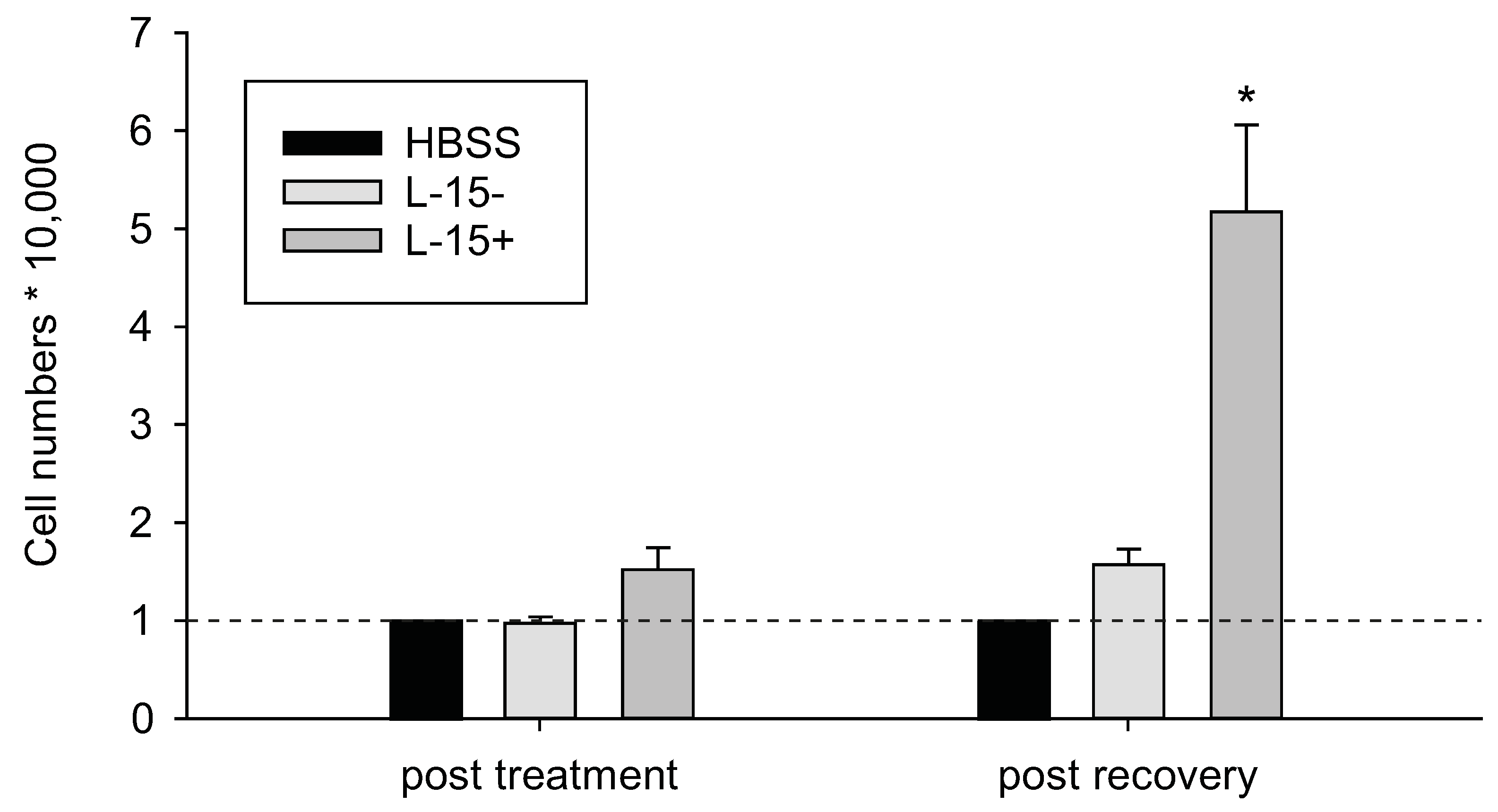 Cell density assay (Hoechst 33342) with Z3 zebrafish cells in control experiments using different culture media. Cell numbers were measured once after the 18 h treatment and once after the 6 h recovery period. L-15−: L-15 complete media without FBS L-15+: L-15 complete media. Cell numbers were normalized to 10,000 cells of the Hank’s buffered salt solution (HBSS) control. Statistical analysis was performed prior to data normalization using a t-test. Groups were compared to HBSS treatment (* p ≤ 0.05). Values are mean ± standard error from 3 biological replicates.