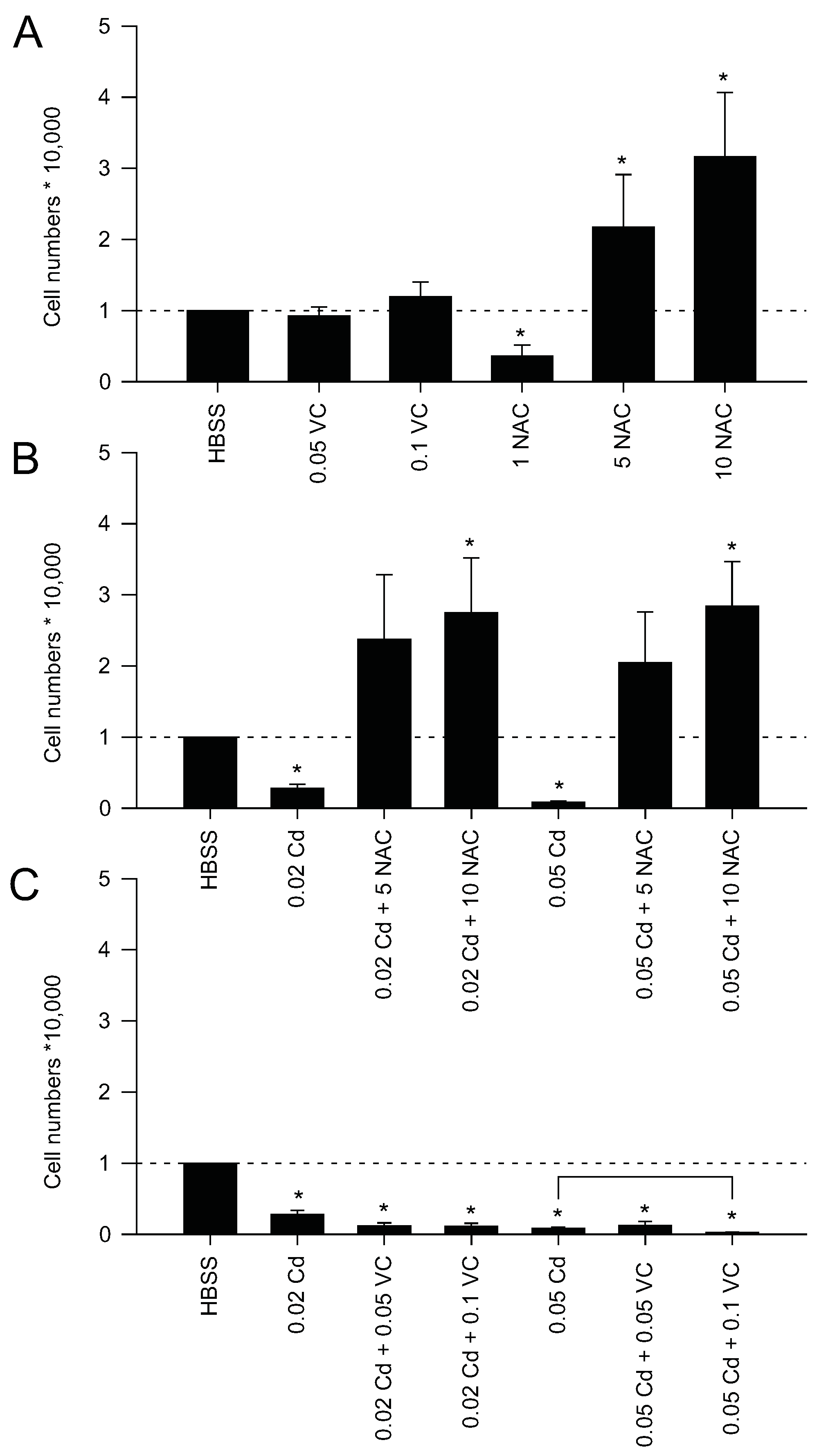 Cell density assay (Hoechst 33342) with Z3 zebrafish cells. (A) Effect of vitamin C (VC) and N-acetylcysteine (NAC) on HBSS incubated cells; (B) Recovery from HBSS and Cd treatment using NAC; (C) Recovery from HBSS and Cd treatment using VC. Cell numbers were normalized to 10,000 cells of the HBSS control. Statistical analysis was performed prior to data normalization using a t-test. Exposures were compared to HBSS treatment (* p ≤ 0.05). Square bracket indicates statistical significance from comparison of normalized data. Values are mean ± standard error from 3 biological replicates.