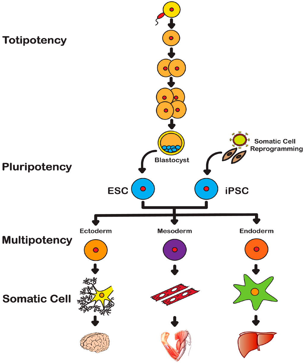 Totipotency: After fertilization, Embryonic Stem Cells (ESCs) maintain the ability to form all three germ layers as well as extra-embryonic tissues or placental cells and are termed as totipotent. Pluripotency: These more specialized cells of the blastocyst stage maintain the ability to self-renew and differentiate into the three germ layers and down many lineages but do not form extra-embryonic tissues or placental cells. Reprogrammed somatic cells, iPSCs, also demonstrate the ability to self-renew and differentiate into all three germ layers in vivo and in vitro. Thus, iPSCs are also considered to be pluripotent stem cells. Multipotency: Adult or somatic stem cells are undifferentiated cells found in postnatal tissues. These specialized cells are considered to be multipotent; with very limited ability to self-renew and are committed to lineage specific differentiation.
