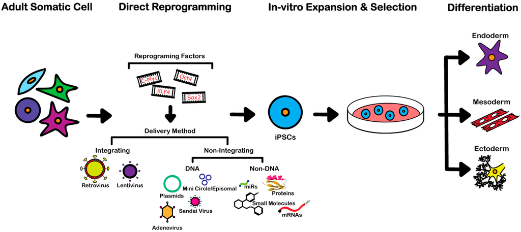 The direct reprogramming of somatic cells to induced pluripotent stem cells (iPSCs) can be achieved through the ectopic expression of specific transcription factors: Oct-4, C-Myc, Sox-2 and Klf-4, the “Yamanaka or OSKM Factors”. Delivery of these factors can be accomplished through a variety of methods. Initial methods developed integrating retroviral or lentiviral vectors. More recent strategies utilized non-integrating methods, further categorized by the use of DNA such as plasmids, mini circles/episomal, adenovirus, Sendai virus, and non-DNA based procedures such as, mRNAs, microRNAs (miRs), small molecules and bioactive proteins. Once reprogrammed to a pluripotent state, iPSCs can be expanded in vitro and subsequently differentiated to ectoderm, mesoderm and endoderm linages for use in cell therapy, disease modeling and drug discovery.
