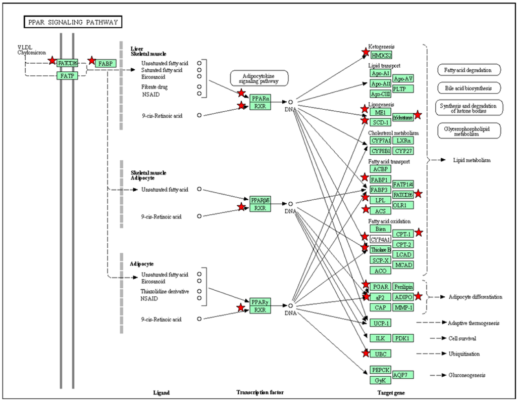 | Kidney | 19 | Hmgcs2, Acsl3, Adipoq, Angptl4, Cpt1b, Cyp4a8, Cyp4a1, Fabp1, Fabp4, Fabp7, Fads2, Lpl, Me1, Ppara, Rxrg, Acaa1, Cd36, Ubc and Scd | 6.7 × 10−4 | 4.0 × 10−2 |