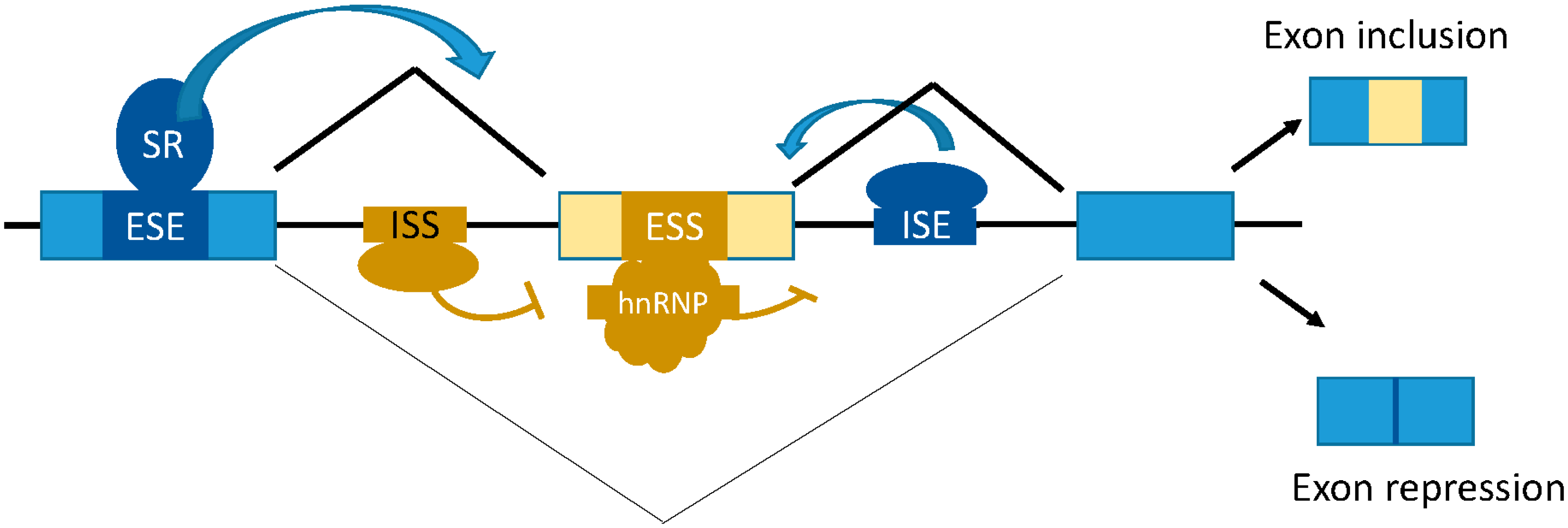 - Zhu, J.; Mayeda, A.; Krainer, A.R. Exon identity established through differential antagonism between exonic splicing silencer-bound hnRNP A1 and enhancer-bound SR proteins. Mol. Cell 2001, 8, 1351–1361. [Google Scholar] [CrossRef]