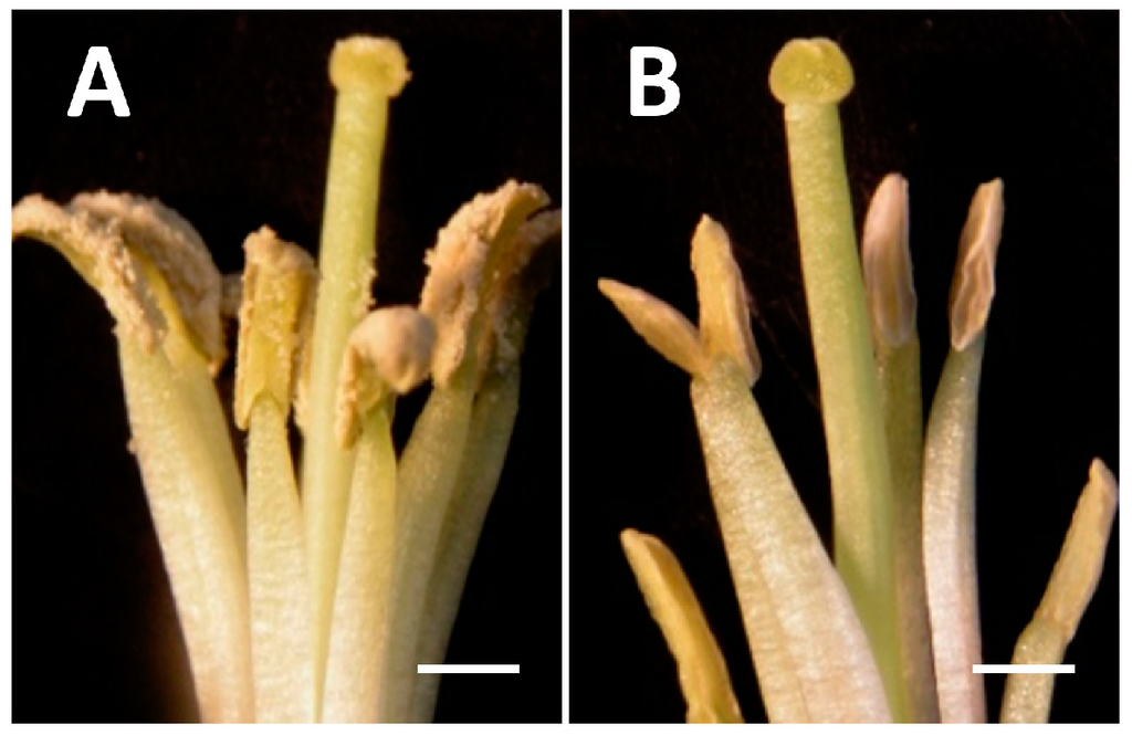 Partially dissected radish flowers. Male fertile plant (A); and male sterile plant (B). Bar = 1 mm.