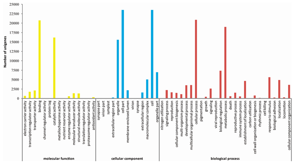 GO annotation including three ontologies (molecular function, cellular component and biological process) is an international gene classification system that provides a dynamically-updated standardized vocabulary for assigning functions of genes and their products [30]. BLAST2GO program was employed to find GO terms for assembled unigenes and 29,031 unigenes were assigned at least one GO term in 55 functional groups. Of these, most were assigned to the biological process ontology (86,785; 41.2%), followed by cellular component (78,749; 37.4%) and molecular function (45,090; 21.4%) ontologies (Figure 3).