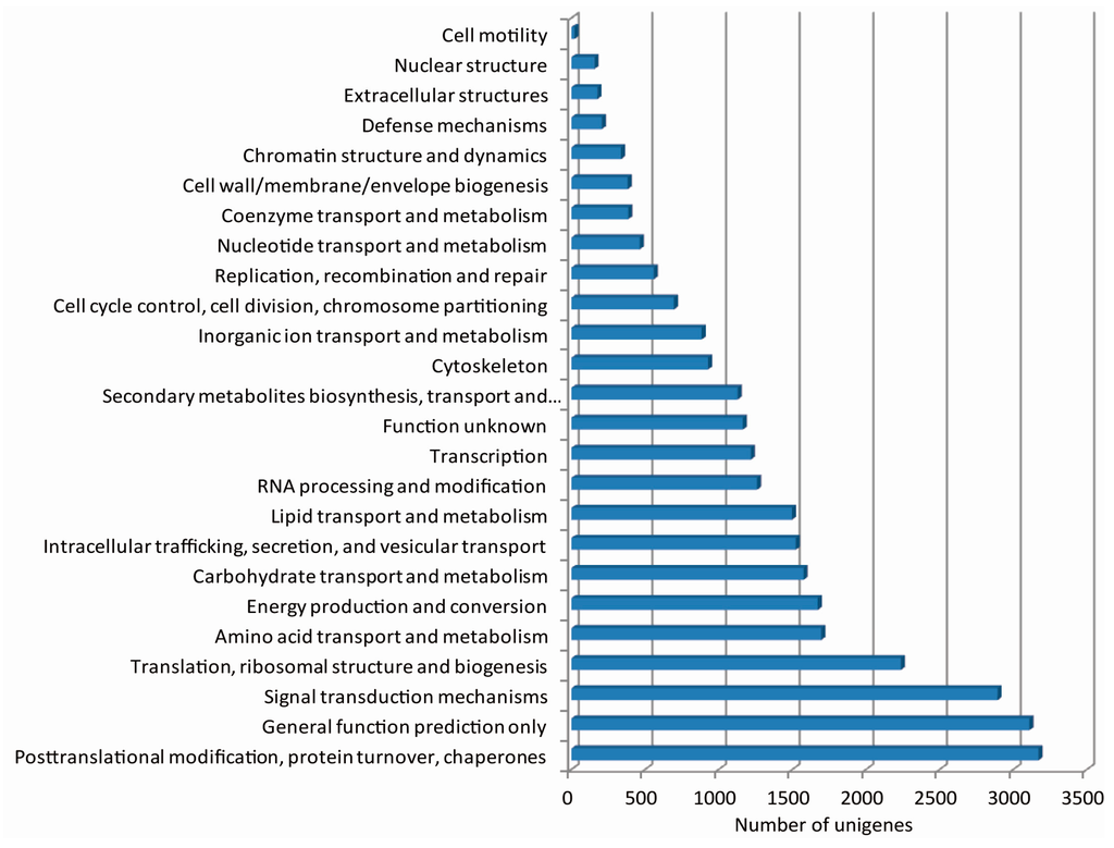 The KOGs, based on orthologous relationships between genes, include proteins encoded by seven sequenced eukaryotic genomes [31]. In total, 26,527 unigenes were assigned to the KOG classification. Because some unigenes were annotated with multiple KOG functions, a total of 29,353 functional annotations were obtained. The four largest groups annotated were “posttranslational modification, protein turnover, chaperones” (3171 unigenes), “general function prediction only” (3110 unigenes), “signal transduction mechanisms” (2893 unigenes) and “Translation, ribosomal structure and biogenesis” (2237 unigenes) (Figure 4).