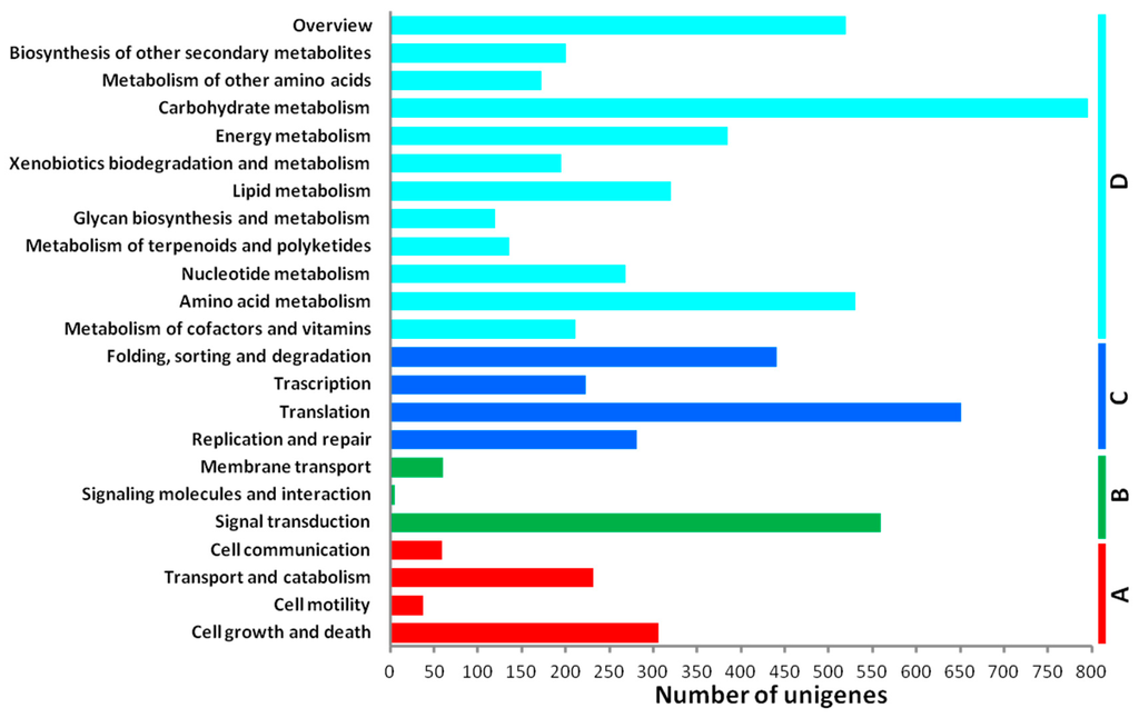 Classification based on categories of KEGG pathways. Cellular Processes (A); Environmental Information Processing (B); Genetic Information Processing (C); and Metabolism (D). The x-axis indicates the number of unigenes in a function class; the y-axis indicates the function classes.