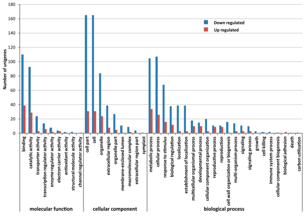 Gene Ontology classification of down- and up-regulated unigenes in floral buds in CMS lines compared with maintainer lines. The x-axis indicates the sub-categories; the y-axis indicates the number of unigenes in a sub-category.