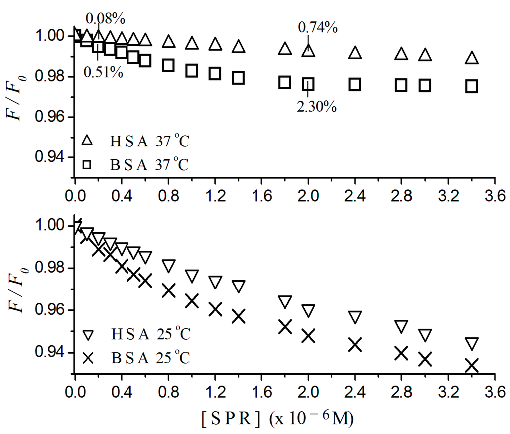 Normalized fluorescence quenching plots of human serum albumin (HSA) and bovine serum albumin (BSA) titrated with sulpiride at 25 and 37 °C. Excitation λ = 290 nm; [albumin] = 2 × 10−6 M; 10−3 M phosphate buffer, pH 7.4. [SPR] = sulpiride concentration.